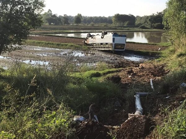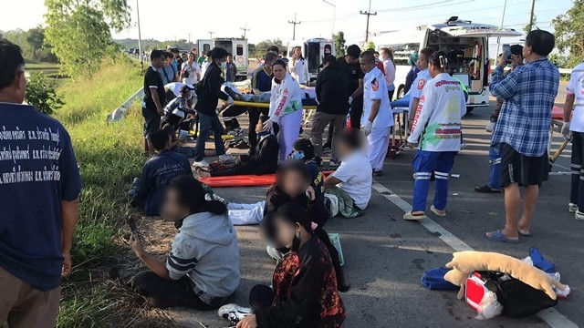 ร้อยเอ็ด…หวิดดับยกคัน“บัส”รับส่งพนักงานเสียหลัก ชนเสาไฟฟ้าพลิกคว่ำล้อชี้ฟ้า เจ็บกว่า 20 ราย