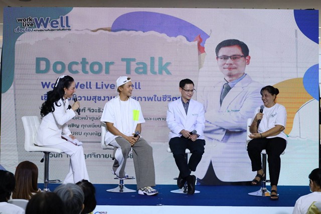 โซนเวที Well-being Talkเสวนาให้ความรู้โดยนพ.รัฐพงศ์ จิวะรังสินี หัวหน้าศูนย์เบาหวาน โรคต่อมไร้ท่อและเมตะบอลิซึมกับแขกรับเชิญ คุณเนียน สุระดา ร่วมแบ่งปันประสบการณ์จริงในการดูแลตนเอง พร้อม Health Guru คุณณัฏฐ์ ทิวไผ่งาม ร่วมพูดคุยเคล็ดลับการออกกำลังกายและดูแลสุขภาพ
