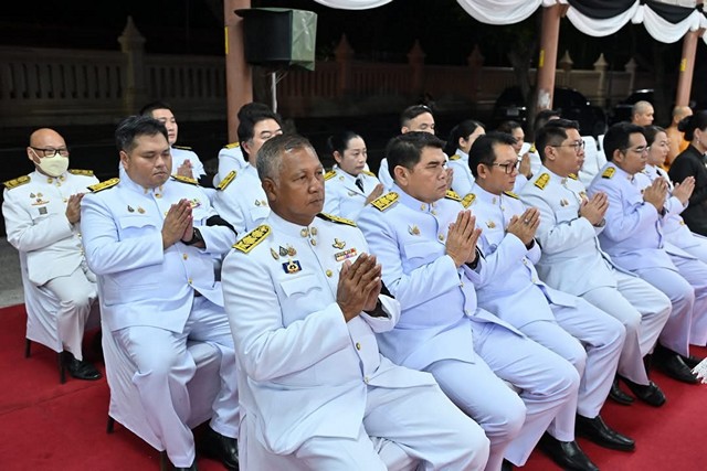นครปฐม-รองผู้ว่าราชการจังหวัดนครปฐม นำข้าราชการ และประชาชน ร่วมพิธีบำเพ็ญกุศลพระพิธีธรรมสวดพระอภิธรรม เพื่ออุทิศถวายพระราชกุศลแด่ สมเด็จพระนางเจ้าสิริกิติ์ พระบรมราชินีนาถ พระบรมราชชนนีพันปีหลวง