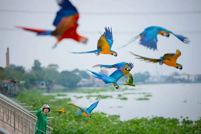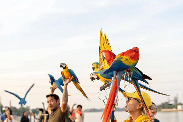 โดยในงานจะนำนกแก้วมาคอร์หลายสีสันมาปล่อยบินอิสระ ที่มีการฝึกฝนให้นกได้ออกโบยบินในพื้นที่กว้างได้อย่างอิสระและสามารถกลับมาหาผู้เลี้ยง หรือกลับมาตามคำสั่งของเจ้าของได้ คล้ายกับการฝึกสุนัขให้ทำตามสั่ง ซึ่ง มาคอว์จัดเป็นนกในตระกูลปากขอที่มีขนาดใหญ่ นิยมเลี้ยงกันมากเนื่องจากมีสีสันที่สวยงาม เชื่อง เป็นนกที่ชอบเข้าสังคมและน่ารักสามารถเป็นเพื่อนที่ดีได้ มีความฉลาดมาก มีความสามารถในการเลียนแบบเสียงคนได้