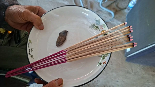 ผู้สื่อข่าวจึงได้เดินทางไป บริเวณร้านขายผลไม้ซึ่งเป็นซุ้มมุงหลังด้วยผ้ากันสาดเปิดโล่ง ตั้งอยู่ริมถนน หมู่ที่ 9 ต.แม่พูล อ.ลับแล จ.อุตรดิตถ์ ก่อนถึงตลาดกลางผลไม้สินค้าโอทอปเทศบาลหัวดง ซึ่งได้พบกับนายชัยมงคล สว่างกิจ อายุ 60 ปี หรือคุณป้อม ขณะกำลังนั่งขายผลไม่อยู่ ในคอพบว่าคุณป้อมได้แขวนหินสีดำทึบ ลักษณะคล้ายแร่เหล็กไหล หลายก้อน