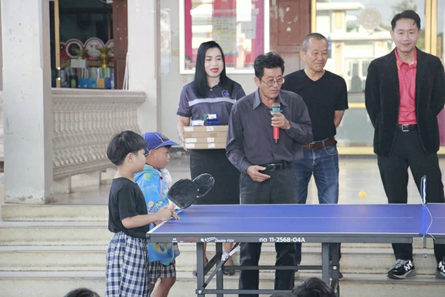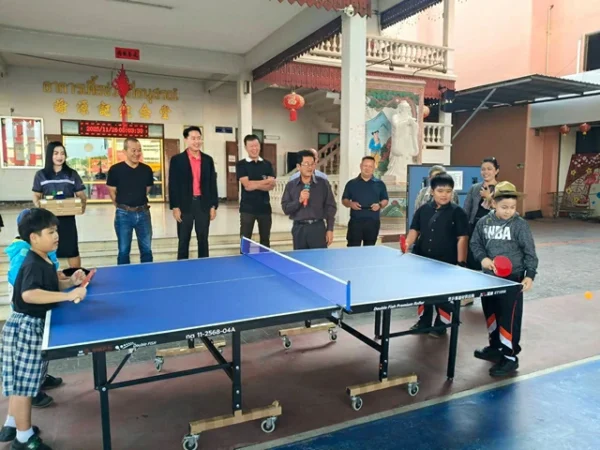 สุโขทัย-คณะกรรมการสมาคมพ่อค้าสุโขทัยร่วมใจจัดซื้อโต๊ะปิงปองส่งเสริมนักเรียกวางตงเล่นกีฬาเทเบิลเทนนิส