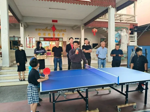 สุโขทัย-คณะกรรมการสมาคมพ่อค้าสุโขทัยร่วมใจจัดซื้อโต๊ะปิงปองส่งเสริมนักเรียกวางตงเล่นกีฬาเทเบิลเทนนิส