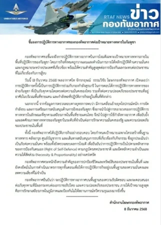 กองทัพอากาศขอชี้แจงถึงการปฏิบัติการทางอากาศในการโจมตีเฉพาะเป้าหมายทางทหารภายในพื้นที่ปฏิบัติการของกัมพูชา โดยภารกิจทั้งหมดถูกวางแผนและดำเนินการภายใต้หลักปฏิบัติด้านความมั่นคงและกฎหมายระหว่างประเทศที่เกี่ยวข้อง พร้อมให้ความสำคัญสูงสุดต่อการป้องกันผลกระทบต่อประชาชนที่ไม่เกี่ยวข้องกับการสู้รบ