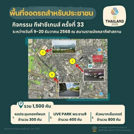 วันนี้ (9 ธันวาคม 2568) พล.ต.ท.นิธิธร จินตกานนท์ ผู้บัญชาการศึกษา ในฐานะหัวหน้าคณะทำงานเสริมสร้างภาพลักษณ์ตำรวจจราจร ศูนย์บริหารงานจราจร สำนักงานตำรวจแห่งชาติ (ศจร.ตร.) เปิดเผยว่า พล.ต.อ.สำราญ นวลมา รองผู้บัญชาการตำรวจแห่งชาติ (รอง ผบ.ตร.) ในฐานะผู้อำนวยการศูนย์บริหารงานจราจร สำนักงานตำรวจแห่งชาติ ได้สั่งการกำชับให้กองบัญชาการตำรวจนครบาลจัดเตรียมกำลังตำรวจจราจรเต็มอัตราเพื่ออำนวยความสะดวกด้านการจราจร และดูแลประชาชนพร้อมประชาสัมพันธ์เส้นทางการจราจรให้ประชาชนได้รับทราบ ในห้วงที่ประเทศไทยเป็นเจ้าภาพมหกรรมกีฬาซีเกมส์ ครั้งที่ 33 หรือ ซีเกมส์ 2025 ระหว่างวันที่ 9-20 ธันวาคม 2568 โดยมี 11 ชาติเข้าร่วม ซึ่งจัดการแข่งขันใน 10 จังหวัดทั่วประเทศไทย โดยเฉพาะในพื้นที่กรุงเทพมหานคร มีการแข่งขันถึง 32 สนาม