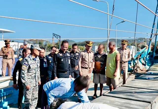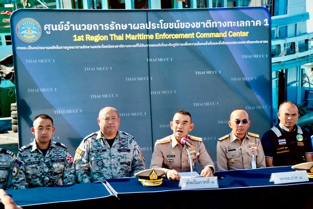 กองทัพเรือ โดย ทัพเรือภาคที่ 1 บูรณาการร่วมกับ ศรชล.ภาค 1 และหน่วยงานที่เกี่ยวข้อง แถลงข่าวการจับกุมเรือบรรทุกน้ำมันผิดกฎหมาย ณ ท่าเรือกองบัญชาการกองเรือยุทธการกลางอ่าว