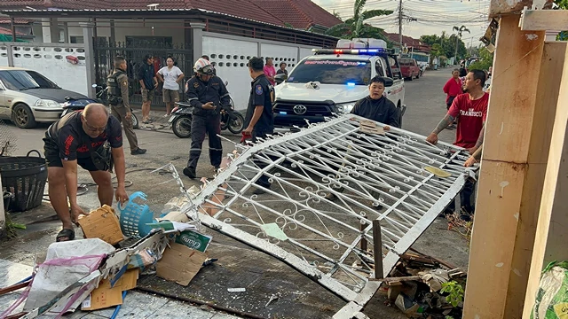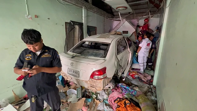 ชลบุรี-หนุ่มควบเก๋งชนรั้ว พุ่งทะลุเข้าบ้าน ชนอัดกำแพง เจ้าของบ้านถูกกำแพงถล่มทับเจ็บคาห้องน้ำ