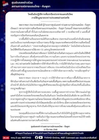 ประเทศไทยขอยืนยันอย่างชัดเจนว่า ไม่ได้เป็นฝ่ายเริ่มต้นความรุนแรง แต่จำเป็นต้องใช้สิทธิในการป้องกันตนเอง เพื่อคุ้มครองอธิปไตย ความมั่นคง และความปลอดภัยของประชาชน
