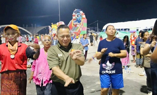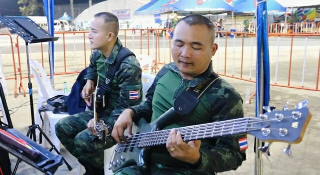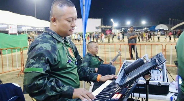 งานนี้หมวดดุริยางค์ยกทีมมาเปิดดนตรีสด ทั้งร้อง ทั้งเล่น แถมยังลงมารำร่วมกับชาวบ้านแบบไม่หวงพลัง เรียกเสียงหัวเราะดังลั่น โดยเฉพาะหนึ่งในทหารชายที่โดดเด่นสุด ๆ ด้วยการ เต้นโยกเอวแบบจัดเต็ม ส่ายเอวไม่พักจน ผู้เฒ่าผู้แก่เอ่ยปากแซวว่า “เต้นแรงขนาดนี้ หายาหม่องมาทาให้ไหมพี่!”