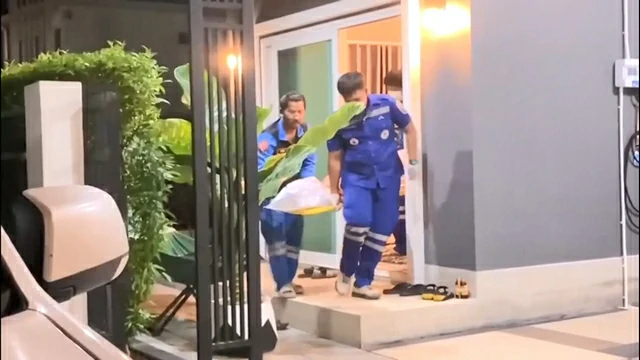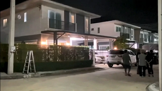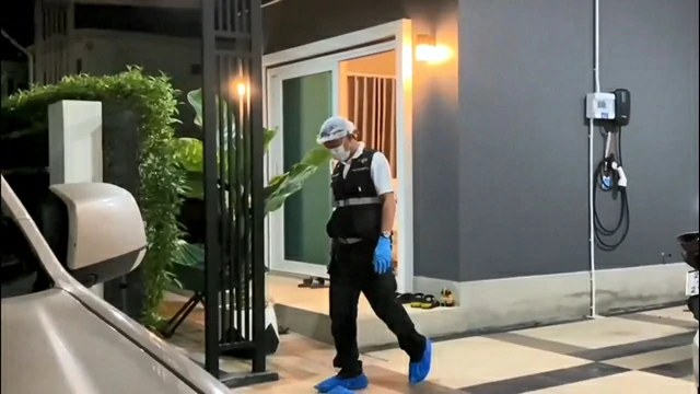 ที่ เกิดเหตุภายในหมู่บ้านพบเป็นบ้านพักส่วนตัว 2 ชั้น ตรวจสอบห้องนอนชั้น 2 พบศพผู้เสียชีวิตเป็นชาย 1 ราย และหญิง 1 ราย อยู่ในสภาพนอนกอดกัน เบื้องต้นทั้งคู่อายุ 44 ปี เป็นสามีภรรยากัน ตรวจสอบสภาพศพฝ่ายชายที่บริเวณขมับขวาพบรอยรูกระสุนปืนจำนวน 1 รู นอนทับบนตัวผู้หญิงในท่านอนกอด ตรวจสอบสภาพศพฝ่ายหญิงที่บริเวณขมับขวา พบรอยรูกระสุนปืนจำนวน 3 รู จากการตรวจสอบโดยรอบพบปลอกกระสุนปืน 9 มม. ตกอยู่ที่พื้นห้องนอน จำนวน 4 ปลอก เจ้าหน้าที่กองพิสูจน์หลักฐาน 9 จึงได้เก็บไว้เป็นหลักฐาน