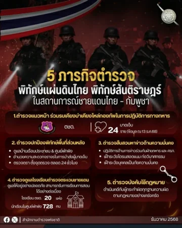 ผบ.ตร.กำชับตำรวจเดินหน้า 5 ภารกิจพิทักษ์อธิปไตยชายแดนไทย – กัมพูชา “ตชด. และชุดปฏิบัติการพิเศษ” สู้แนวหน้า พิทักษ์ส่วนหลัง ปกป้อง สืบสวน ดูแล บังคับใช้กฎหมายเข้ม