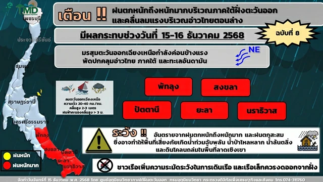 วันนี้ 15 ธันวาคม 2568 ศูนย์อุตุนิยมวิทยาภาคใต้ฝั่งตะวันออก ประกาศฉบับที่ 8 (80/2568) เรื่อง ฝนตกหนักถึงหนักมากบริเวณภาคใต้ฝั่งตะวันออกและคลื่นลมแรงบริเวณอ่าวไทยตอนล่าง (มีผลกระทบช่วงวันที่ 15-16 ธันวาคม 2568) มรสุมตะวันออกเฉียง เหนือกำลังค่อนข้างแรงพัดปกคลุมอ่าวไทย ภาคใต้และทะเลอันดามัน ลักษณะเช่นนี้ทำให้ภาคใต้ฝั่งตะวันออกช่วงวันที่ 15-16 ธันวาคม 2568 ยังคงมีฝนต่อเนื่องและมีฝนหนัก ถึงหนักมากบางแห่งบริเวณจังหวัดพัทลุง สงขลา ปัตตานี ยะลา และนราธิวาส