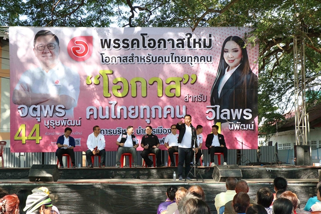“จตุพร บุรุษพัฒน์” หัวหน้าพรรคโอกาสใหม่ พร้อมด้วย “ประภาส ยงคะวิสัย” หรือ“แอสป้า” แม่ทัพภาคอีสานพรรคโอกาสใหม่ และกรรมการบริหารพรรค บุกกาฬสินธุ์เปิดเวทีปราศรัยหาเสียงช่วย “วิไลพร นิพัฒน์” อดีต รองนายก อบจ.กาฬสินธุ์ ผู้สมัคร สส.กาฬสินธุ์ เขต 5 พรรคโอกาสใหม่ เบอร์ 4 เอาใจชาวอำเภอกมลาไสย และชาวอำเภอร่องคำ ด้วยนโนบายโดนใจประชาชนและเกษตร เพิ่มพื้นสีเขียว น้ำถึงไร่นา ประปาครบทุกหมู่บ้าน นโยบายแก้ปัญหาเรื่องที่ดินภายใน 6 เดือน ร้านค้าธงเขียวโครงการสินค้าเกษตรราคาถูก และแช่แข็งหนี้ 10 ปี ขณะที่ “ประภาส” แม่ทัพภาคอีสานย้ำ “มีเราไม่มีมืด” มีโอกาสใหม่ที่ไหนความสว่างอยู่ที่นั้น ชูนโยบายใช้ไฟฟรี 300 บาท ติดตั้งโซล่าร์รูฟใช้ไฟฟรีตลอดชีวิต “ท้องปุ๊บ ดื่มนมปั๊บ ”1 หมู่บ้าน 1 รถเกี่ยวข้าว
