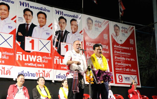 พรรคเพื่อไทยเปิดฉากบุกอีสานโชว์พลัง “จุลพันธ์-ณัฐวุฒิ-จิราพร” ลุยกาฬสินธุ์ปราศรัยหาเสียงช่วย “ทินพล ศรีธเรศ” กาฬสินธุ์ เขต 5 ชูสโลแกน “เพื่อไทยทำได้” นโยบายยกเครื่องประเทศไทย มัดใจพี่น้องชาวกาฬสินธุ์ พร้อมมั่นใจรักษาเก้าอี้สส.เขต 5 ได้ ตอกย้ำความเป็นพรรคขวัญใจประชาชน