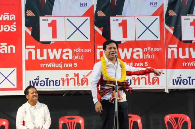 พรรคเพื่อไทยเปิดฉากบุกอีสานโชว์พลัง “จุลพันธ์-ณัฐวุฒิ-จิราพร” ลุยกาฬสินธุ์ปราศรัยหาเสียงช่วย “ทินพล ศรีธเรศ” กาฬสินธุ์ เขต 5 ชูสโลแกน “เพื่อไทยทำได้” นโยบายยกเครื่องประเทศไทย มัดใจพี่น้องชาวกาฬสินธุ์ พร้อมมั่นใจรักษาเก้าอี้สส.เขต 5 ได้ ตอกย้ำความเป็นพรรคขวัญใจประชาชน