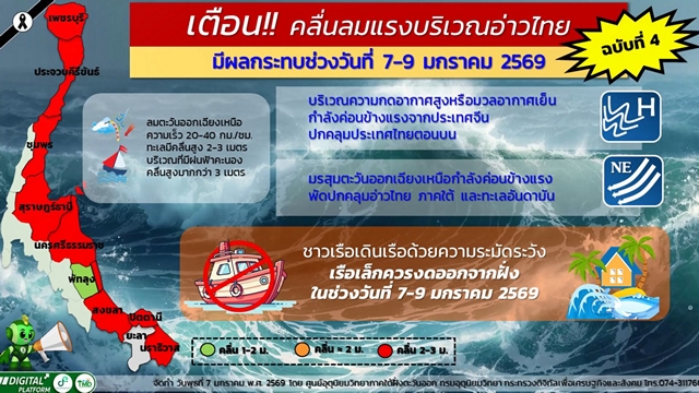 วันนี้ ( 7 ม.ค.69) ศูนย์อุตุนิยมวิทยาภาคใต้ฝั่งตะวันออก ประกาศฉบับที่ 4 (4/2569) เรื่อง คลื่นลมแรงบริเวณอ่าวไทย (มีผลกระทบช่วงวันที่ 7- 9 มกราคม 2569) บริเวณความกดอากาศสูงหรือมวลอากาศเย็นกำลังค่อนข้างแรงจากประเทศจีนปกคลุม ประเทศไทยตอนบน ประกอบกับมรสุมตะวันออกเฉียงเหนือกำลังค่อนข้างแรงพัดปกคลุมอ่าวไทย ภาคใต้ และทะเลอันดามัน ลักษณะเช่นนี้ทำให้ในช่วงวันที่ 7- 9 มกราคม 2569 คลื่นลมบริเวณอ่าวไทยมีกำลัง ค่อนข้างแรง โดยทะเลมีคลื่นสูง 2-3 เมตร บริเวณที่มีฝนฟ้าคะนองคลื่นสูงมากกว่า 3 เมตร ขอให้ประชาชน ที่อาศัยบริเวณชายฝั่งระวังอันตรายจากคลื่นที่ซัดเข้าหาฝั่ง ชาวเรือควรเพิ่มความระมัดระวังในการเดินเรือ หลีกเลี่ยงการเดินเรือในบริเวณที่มีฝนฟ้าคะนอง และเรือเล็กควรงดออกจากฝั่งในช่วงวันที่ 7- 9 มกราคม 2569 จึงขอให้ประชาชนติดตามข่าวพยากรณ์อากาศจากศูนย์อุตุนิยมวิทยาภาคใต้ฝั่งตะวันออก อย่างใกล้ชิด