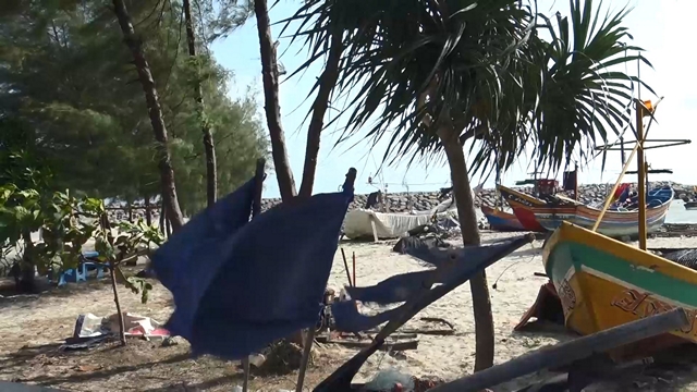 ต้องรีบสาวอวนขึ้นเรือและมานั่งปลดกุ้งปลาออกจากอวนบนฝั่ง ชาวประมงพื้นบ้านบ่ออิฐออกเรือจับปลาได้เพียง 3 วัน คลื่นก็กลับมารุนแรงอีกครั้ง บริเวณบนชายหาดบ่ออิฐวันนี้ มีเรือประมงพื้นบ้านจอดเรียงรายเต็มชายหาด บางลำใช้เวลาว่างช่วงไม่ออกเรือนำสีมาทาเพลาใบพัดเครื่องเรือเพื่อป้องกันสนิมจากไอน้ำเค็ม ชาวประมงพื้นบ้านบอกว่าวันนี้มีลมตั้งแต่ย่ำรุ่ง หมายถึงทะเลมีคลื่นจึงไม่นำเรือออก ออกเรือได้เพียง 3 วันวันนี้ก็ต้องหยุดอีก