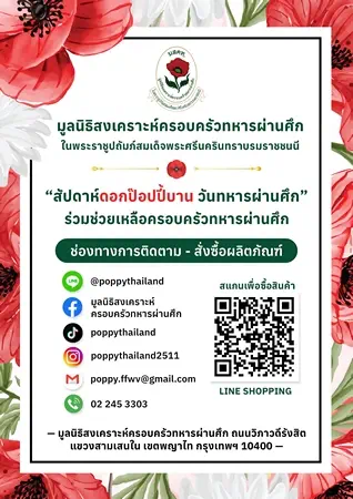 มูลนิธิฯ จึงขอเชิญชวนทุกท่านอุดหนุนดอกป๊อปปี้ที่จะได้จำหน่ายตามสถานที่ต่างๆ และผลิตภัณฑ์ อาทิ เสื้อยืด กระเป๋า แก้วน้ำ ร่ม ชุดกาแฟ ฯลฯ สามารถซื้อได้ที่ มูลนิธิสงเคราะห์ครอบครัวทหารผ่านศึก ถนนวิภาวดีรังสิต โทร 02-2453303, 092-7502642 ID Line : @poppythailand หรือเชิญอุดหนุนผลิตภัณฑ์ได้ทางลิงค์https://shop.line.me/@poppythailand หรือร่วมบริจาคได้ที่ ธนาคารกสิกรไทยสาขาสนามเป้า ชื่อบัญชีมูลนิธิสงเคราะห์ครอบทหารผ่านศึก เลขที่บัญชี 029-2-71777-6 และข้อมูลเพิ่มเติมติดตามได้ที่ Facebook : มูลนิธิสงเคราะห์ครอบครัวทหารผ่านศึก https://www.facebook.com/THAILANDPOPPY LINE : Poppy Thailand (ID: @poppythailand) Instagram : poppythailand2511 Tiktok : @poppythailand