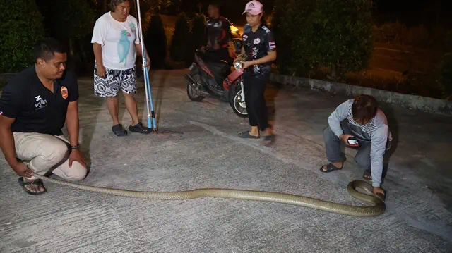 นายนุชดีน หวันสมัน เจ้าของบ้าน เล่าว่า แฟนของตนได้ขี่รถกลับมาจากข้างนอกกำลังจะเข้าบ้าน ก็เห็นงูเลื้อยออกมาจากคูน้ำ เมื่องูเห็นแฟนของตน ก็เลื้อยกลับลงไปในคู แฟนตนตกใจและกลัวงูมาก จึงได้เข้าบ้านปิดประตูขึ้นไปอยู่บนชั้นสองของบ้าน แล้วโทรศัพท์แจ้งเจ้าหน้าที่และตนให้มาช่วยกันจับงูเพื่อนำไปปล่อยคืนสู่ป่าธรรมชาติต่อไป
