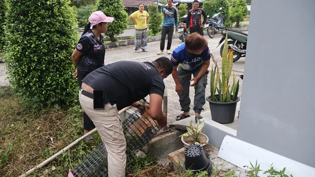 นายนุชดีน หวันสมัน เจ้าของบ้าน เล่าว่า แฟนของตนได้ขี่รถกลับมาจากข้างนอกกำลังจะเข้าบ้าน ก็เห็นงูเลื้อยออกมาจากคูน้ำ เมื่องูเห็นแฟนของตน ก็เลื้อยกลับลงไปในคู แฟนตนตกใจและกลัวงูมาก จึงได้เข้าบ้านปิดประตูขึ้นไปอยู่บนชั้นสองของบ้าน แล้วโทรศัพท์แจ้งเจ้าหน้าที่และตนให้มาช่วยกันจับงูเพื่อนำไปปล่อยคืนสู่ป่าธรรมชาติต่อไป