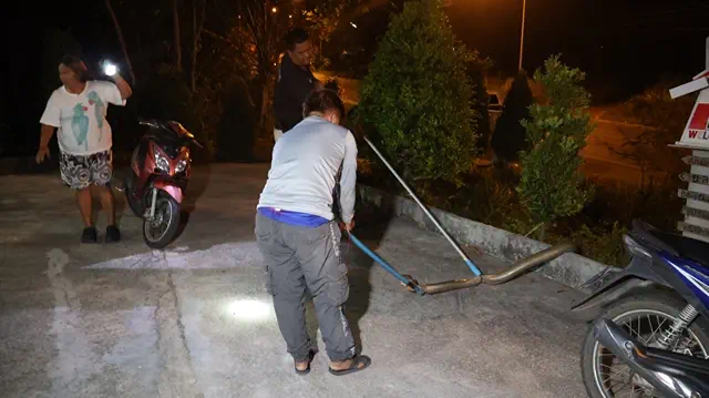 จึงได้นำกรงตาข่าย มาดักตรงทางออกของคูน้ำซึ่งอยู่ติดกับป่า แล้วใช้ไม้ไผ่ยาว แหย่ไล่ให้งูออกมาเข้ากรงตาข่าย ใช้เวลาอยู่นานจนมืดค่ำงูก็ไม่ยอมออกมา จึงต้องยกก้อนอิฐที่ปิดคูน้ำไว้ แล้วไล่ให้งูขึ้นมาจากคูน้ำ แล้ววิ่งไล่ใช้บ่วงคล้องคองู รวมเวลากว่าที่จะจับงูตัวนี้ได้ก็ประมาณ 1 ชม. วัดขนาดความยาวได้ประมาณ 4 เมตร น้ำหนักประมาณ 7 กิโลกรัม คาดว่างูตัวนี้คงเลื้อยมาจากในป่าข้างบ้าน