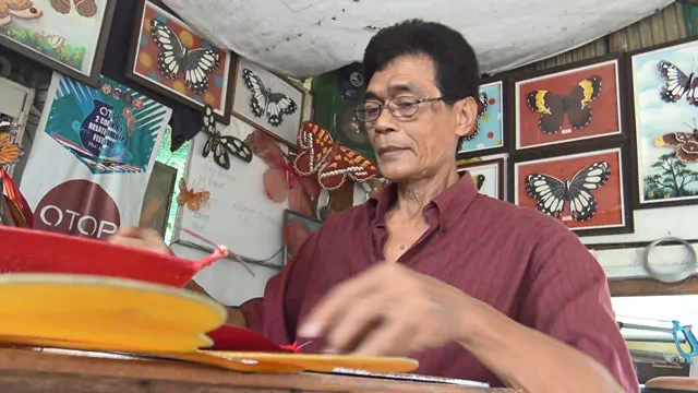 สงขลา-ผีเสื้อผ้าใยบัว ผลิตภัณฑ์โอทอปจังหวัดสงขลามีการพัฒนารูปแบบ นำมาทำเป็นโคมไฟแบบแขวนและแบบตั้งหัวเตียง