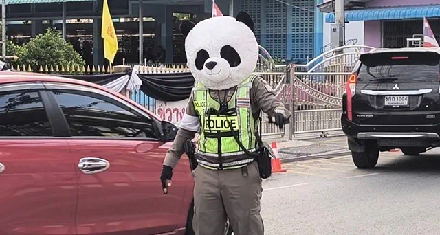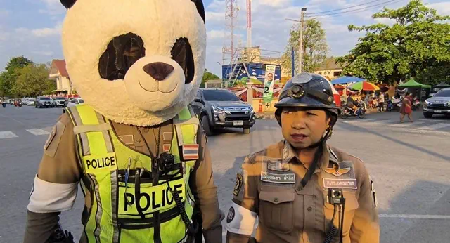 นครนายก – สีสันยามเช้า ตร.จราจรนครนายก โบกรถครบ 7 ปี แปลงร่างเป็นหมีแพนด้า ฯ โบกรถขวัญใจนักเรียนกระตุ้นเด็กอยากมาโรงเรียนแต่เช้าเพื่อจับมือทักทายกัน