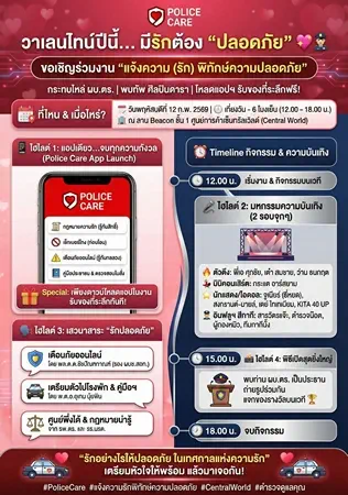 สำนักงานตำรวจแห่งชาติเชิญชวนร่วมกิจกรรมก่อนวาเลนไทน์ งานเปิดตัวแอปพลิเคชัน “POLICE CARE” ณ ลาน Beacon ชั้น 1 ศูนย์การค้าเซ็นทรัลเวิลด์ 12 กุมภาพันธ์นี้