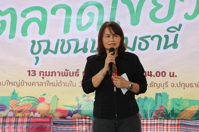 เมื่อวันที่ 13 กุมภาพันธ์ 2569 ณ.โดมใหญ่ข้างศาลาใหม่ วัดสระบัว อ.ธัญบุรี จ.ปทุมธานี ดร.ณัจยา แก้วนุ้ย (ดร.จิ) ผู้จัดการโครงการพัฒนาและขยายผลระบบอาหารเพื่อสุขภาวะตลอดห่วงโซ่ในโรงเรียนและชุมชน ในจังหวัด สงขลา ปทุมธานี สุพรรณบุรี พัทลุง และนครปฐม สนับสนุนโดย สำนักงานกองทุนสนับสนุนการสร้างเสริมสุขภาพ (สสส.) ร่วมกับสมาคมการค้าธุรกิจอาหาร มูลนิธิเครือข่ายพลังสังคม และหน่วยงานภาครัฐ ของจังหวัดปทุมธานี ได้จัดกิจกรรมเปิดตลาดเขียวชุมชนในจังหวัดปทุมธานี อบรมให้ความรอบรู้ด้านอาหารและโภชนาการ เพื่อยกระดับความปลอดภัยทางอาหาร ส่งเสริม สนับสนุนผลผลิตทางการเกษตรปลอดสารพิษ สร้างเมนูอาหารปลอดภัยเพื่อสุขภาพ รณรงค์ลดความเสี่ยงโรค NCDs ลด หวาน มัน เค็ม ในการจัดกิจกรรมตลาดเขียวในชุมชน ครั้งนี้