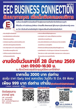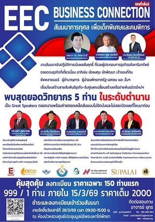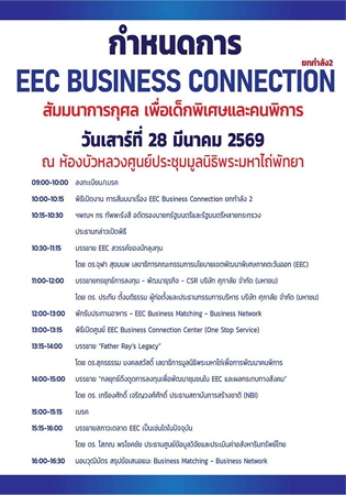 มีรายงานว่า ดร.วิริยพล คณาสิริวัฒน์ ผู้ก่อตั้งและประธานเจ้าหน้าที่บริหารนิตยสารออนไลน์ 3 ภาษา ไทย จีน อังกฤษ ในนาม“TRENDS REAL ESTATE MAGAZINE” และผู้ก่อตั้งและประธาน “EEC BUSINESS CONNECTION” และที่ปรึกษามูลนิธิพระมหาไถ่เพื่อการพัฒนาคนพิการ เตรียมจัดงานสัมมนาการกุศลเพื่อเด็กพิเศษและคนพิการ ภายใต้ชื่องาน “EEC BUSINESS CONNECTION ยกกำลัง 2” ในวันเสาร์ที่ 28 มีนาคม 2569 ณ.ห้องบัวหลวง ศูนย์ประชุมมูลนิธิพระมหาไถ่ พัทยา จ.ชลบุรี