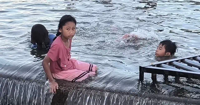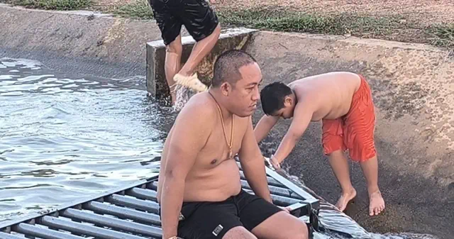 นครนายก – อากาศร้อนจัดชาวบ้านพาลูก-พาหลานเล่นน้ำคลายร้อนที่คลองส่งน้ำศรีนาวา