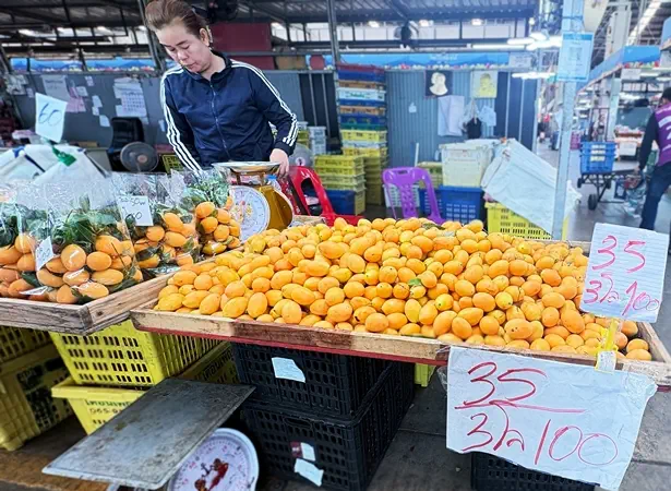 บรรยากาศการซื้อขายในโซนผลไม้ของตลาดสี่มุมเมืองคึกคัก หลังเข้าสู่ช่วงเดือนมีนาคมซึ่งเป็นช่วงผลผลิตออกมากที่สุดของปี โดยเฉพาะมะยงชิด ผลไม้ฤดูสั้นที่มีให้รับประทานเพียงปีละครั้ง ช่วงกุมภาพันธ์–มีนาคม ผลจะมีขนาดใหญ่ เนื้อแน่น รสหวานอมเปรี้ยว แหล่งปลูกสำคัญมาจากจังหวัดนครนายกและพิจิตร ก่อนที่ผลผลิตจะเริ่มลดลงในช่วงต้นถึงกลางเดือนเมษายน ขณะที่มะขามเทศ ผลไม้ยอดนิยมในหน้าร้อน ก็กำลังอยู่ในช่วงที่มีรสชาติอร่อยที่สุดเช่นกัน โดยเฉพาะช่วงกุมภาพันธ์–มีนาคม ที่ฝักแก่จัด เนื้อฟู หวานมัน พันธุ์ที่ได้รับความนิยมคือเนื้อชมพู จากแหล่งปลูกสำคัญในจังหวัดสระบุรีและนครราชสีมา