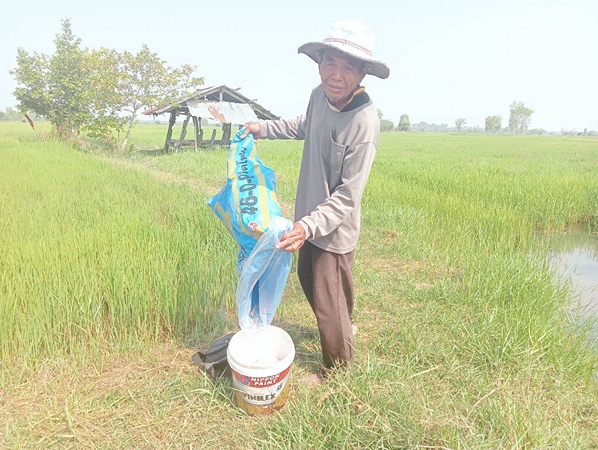 “เมื่อราคาปุ๋ยเคมีสูงขึ้น และไม่มั่นใจว่าจะได้ผลผลิตสูงดังกล่าว ตนและเพื่อนชาวนาหลายราย จึงได้ปรับลดปริมาณการใช้ปุ๋ยเคมีลง เพื่อประหยัดทุนทำนา จากที่เคยใช้ไร่ละ 1 ถุงหรือทั้งหมด 40 ถุง เหลือเพียง 17 ถุงเท่านั้น โดยใช้ปุ๋ยน้ำทางใบหรือฉีดพ่นฮอร์โมนทดแทน และจะหมั่นสำรวจว่าบริเวณใดที่ต้นข้าวเติบโตช้า หรือใบข้าวมีสีเหลือง เพราะรับสารอาหารไม่เพียงพอ จึงจะหว่านเม็ดปุ๋ยเคมีซ้ำ เพื่อให้ต้นข้าวได้แตกกอและออกรวงอย่างเต็มที่
