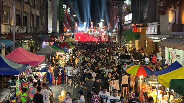 เมื่อช่วงค่ำที่ผ่านมา ที่บริเวณถนนนิพัทธ์อุทิศ 3 และถนนธรรมนูญวิถี มีพี่น้องประชาชนและนักท่องเที่ยวทั้งชาวไทยและชาวต่างชาติมาเลเซียสิงคโปร์อินโดนีเซีย เข้าร่วมเล่นน้ำสงกรานต์ อย่างคับคั่ง และโดยมีการตั้งถึงสามเวทีแต่ละเวทีแน่นไปด้วยผู้คนและทางเทศบาลหาดใหญ่ยังมีหนุ่มหุ่นล่ำบึกคอยฉีดน้ำและยังมีโฟม ฉีดให้พี่น้องประชาชนที่มาร่วมงานเล่นบริเวณเวทีหลักตั้งอยู่ถนนธรรมนูญวิถีหรือแยกโอเดียส่วนที่หน้าลีการ์เด้นก็ไม่แพ้กันมีนักท่องเที่ยวและชาวต่างชาติเต็มทั้งถนน