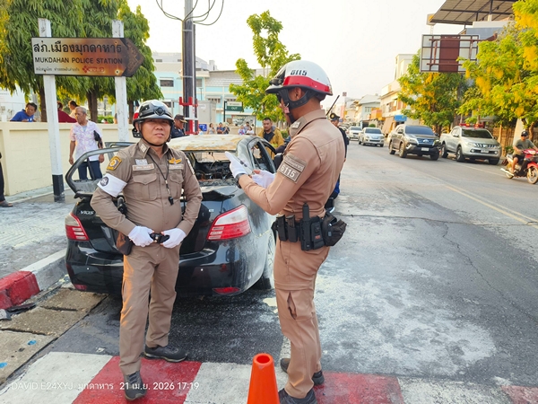 เมื่อวันที่ 21 เมษายน 2569 ที่ผ่านมาศูนย์รับแจ้งเหตุเพลิงไหม้และบรรเทาสาธารณภัย 199 เทศบาลเมืองมุกดาหาร อำเภอเมือง จังหวัดมุกดาหาร ได้รับแจ้งเหตุไฟไหม้รถยนต์บริเวณถนนหน้าอาคารอุบัติเหตุและฉุกเฉิน โรงพยาบาลมุกดาหาร ถนนวิวิธสุรการ ภายในเขตเทศบาลเมืองมุกดาหาร หลังรับแจ้งเจ้าหน้าที่ดับเพลิงพร้อมรถน้ำได้เร่งรุดไปยังที่เกิดเหตุ