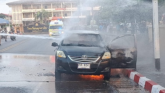 เมื่อถึงจุดเกิดเหตุ พบรถยนต์นั่งส่วนบุคคล ยี่ห้อโตโยต้า วีออส สีดำ หมายเลขทะเบียน กค 824 มุกดาหาร จอดอยู่ริมถนนฝั่งหน้าโรงพยาบาล โดยมีเปลวเพลิงกำลังลุกไหม้จากบริเวณห้องโดยสารและใต้ท้องรถอย่างรุนแรง เจ้าหน้าที่จึงเร่งใช้น้ำฉีดสกัดเพลิง ใช้เวลาประมาณ 5 นาที จึงสามารถควบคุมเพลิงไว้ได้สำเร็จ ท่ามกลางความแตกตื่นของประชาชนและผู้ใช้รถใช้ถนนบริเวณดังกล่าว