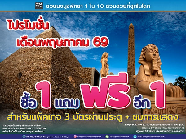 สวนนงนุชพัทยา โดย นายกัมพล ตันสัจจา ประธานสวนนงนุชพัทยา ต้อนรับช่วงใกล้เปิดเทอม จัดโปรโมชั่นสุดคุ้ม “ซื้อ 1 แถมฟรีอีก 1” ตลอดเดือนพฤษภาคม 2569 สำหรับนักท่องเที่ยวชาวไทยที่ Walk-in สามารถรับสิทธิพิเศษทันที เพียงซื้อบัตรผ่านประตูพร้อมชมการแสดง (Package 3) จำนวน 1 ใบ รับฟรีอีก 1 ใบในทันที เหมาะสำหรับการวางแผนท่องเที่ยวแบบครอบครัวในช่วงปิดเทอมปลายที่กำลังจะสิ้นสุด